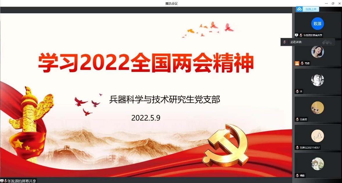 为充分发挥党员的先锋模范作用,增强入党积极分子的党性修养。兵器科学与技术研究生党支部于2022年5月9日晚组织以“红色思想代代传”为主题的实践活动。本次实践活动以腾讯会议展开,会议由兵器科学与技术研究生党支部组织委员张致源、宣传委员高婧主持,支部全体积极分子参会。