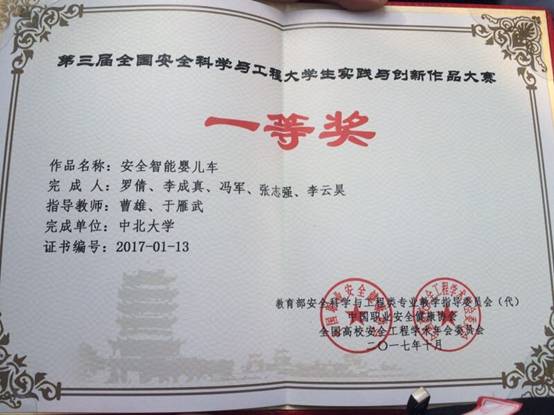 我校由曹雄、于雁武老师指导,罗倩等同学完成的实体作品《安全智能婴儿车》经过层层选拔进入到决赛。通过现场展示,PPT答辩,专家提问等多个环节的激烈角逐后,最终斩获全国一等奖的好成绩。我校由刘迎彬老师指导,方乐等同学完成的软件与仿真模拟作品《BZA-2重大危险源评估系统设计》也荣获全国三等奖的优异成绩。祝贺他们!
