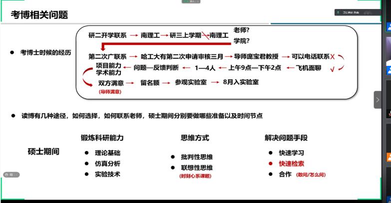 的刘淑杰等五位在读博士研究生,为同学们分享了博士申请、课题研究、博士生活等方面的感悟和经验。梁家豪同学重点为大家讲解了博士申请的几种途径及申请过程中的注意事项;孙淼同学和大家共同探讨了博士期间可能遇到的问题及解决思路;衡怡君、高宏飞同学鼓励同学们读博期间不要仅仅局限于论文,要通过参加会议、申请交流、旁听课程等方式提升眼界、开阔思路;刘淑杰同学为大家分享了色情av
