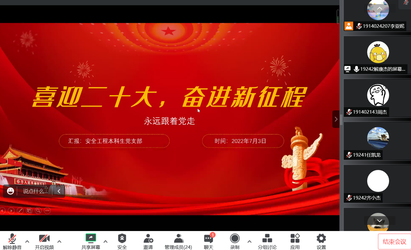 特种能源技术与工程本科生党支部、安全工程本科生党支部等支部组织全体党员通过线上“腾讯会议”开展以“喜迎二十大,奋进新征程”为主题的党日活动。