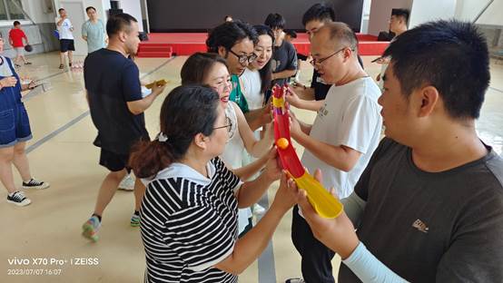 本次趣味运动会共有无敌风火轮、群龙取水、不倒森林、珠行万里、保龄球、激情节拍等6个项目。教师们以学科专业方向为单位共分为5组,在裁判的一声哨响后,趣味运动拉开了序幕,保龄球大战让大家热热身,展示了一下稳、准、狠身手。第二个项目进行了“珠行万里”的比赛,加油声、欢呼声持续不断。团队成员们共同配合,展现出团队极强的凝聚力和战斗力。把整场活动推向了高潮,大家一起努力、一起思考,取长补短、通力合作,充分发挥和调动每一位成员的智慧和力量。汗水与笑声交融,付出与收获相伴,点点滴滴都成为了大家心中美好的回忆。