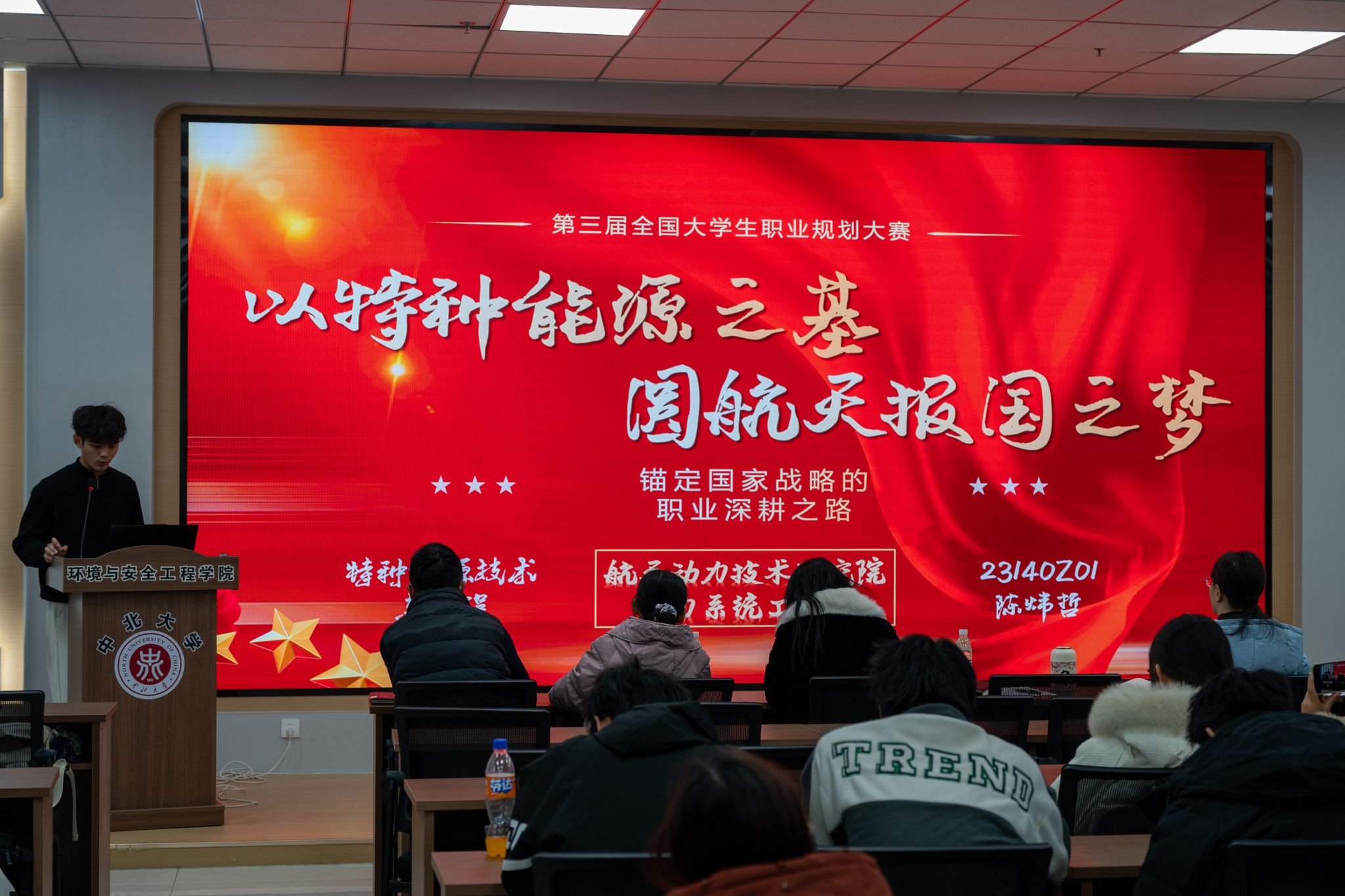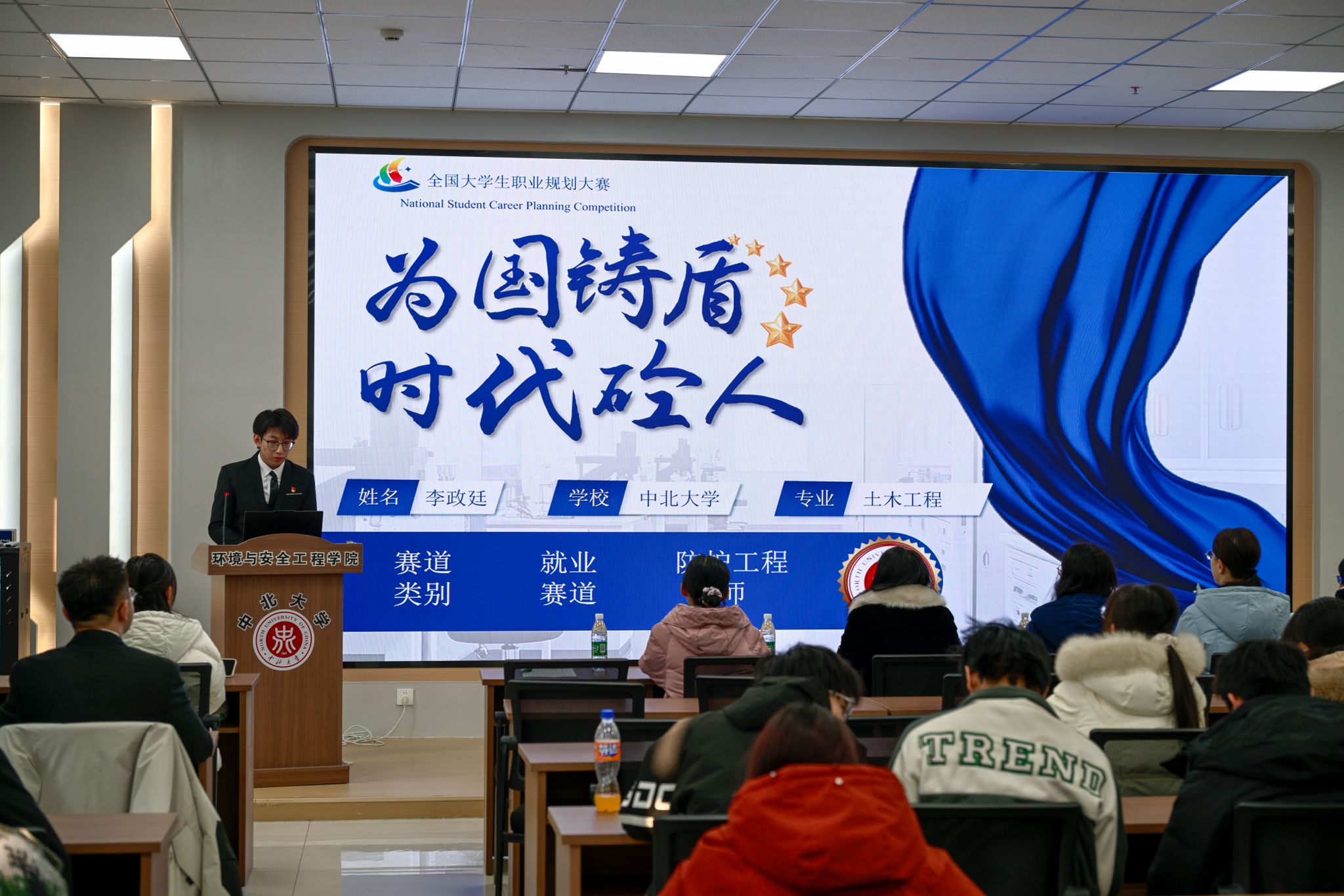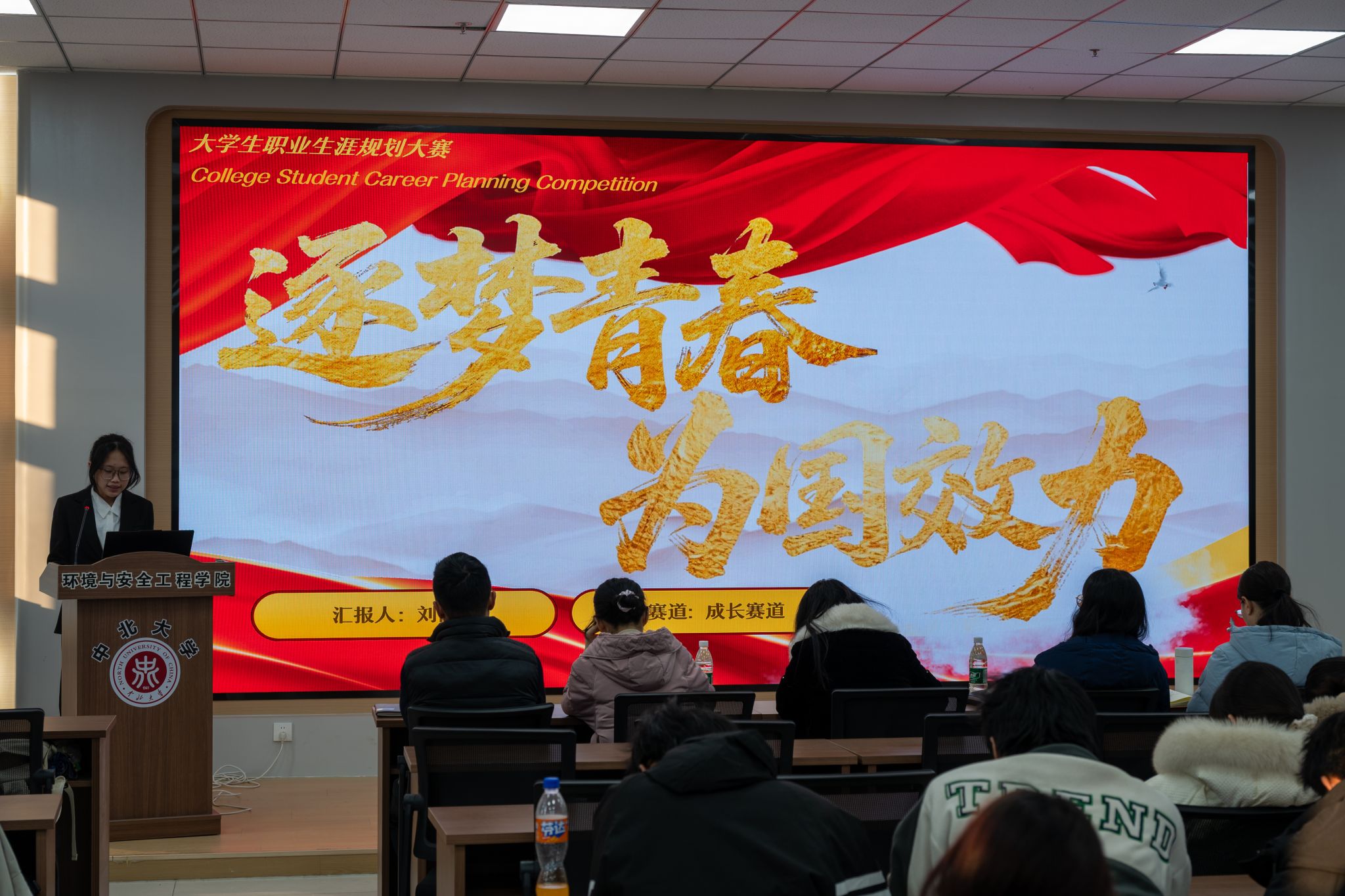 大学生职业规划大赛在学院楼A115教室成功举办。院团委书记陈靓、辅导员担任评委,各部门学生骨干共同到场观赛,见证选手们的青春风采。