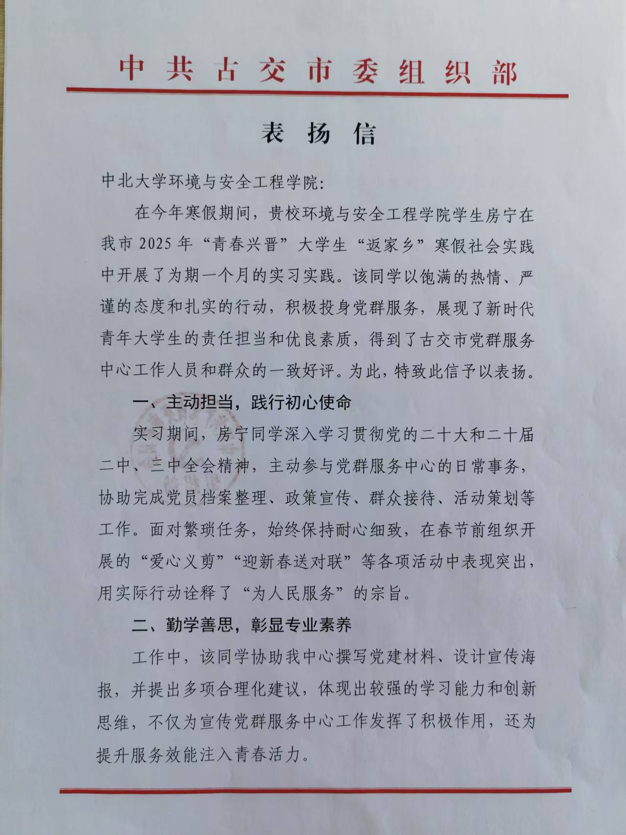 在为期一个月的实习实践中,房宁同学展现出了新时代青年大学生的责任担当与优良素质,得到了古交市党群服务中心工作人员和群众的一致好评。具体表现如下: