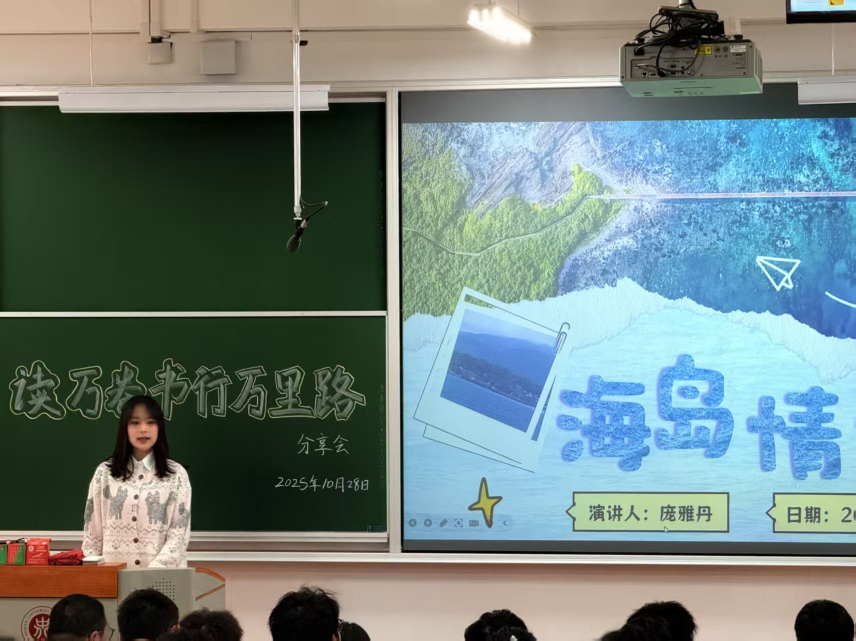 “读万卷书,行万里路”活动在18101H教室成功举办。本次活动以“一书一地”为创意主线,吸引12名师生深度参与,通过12个核心分享环节与3个趣味互动游戏的巧妙串联,搭建起“阅读”与“行走”的双向联结桥梁,实现了知识感悟与实践体验的深度交融。