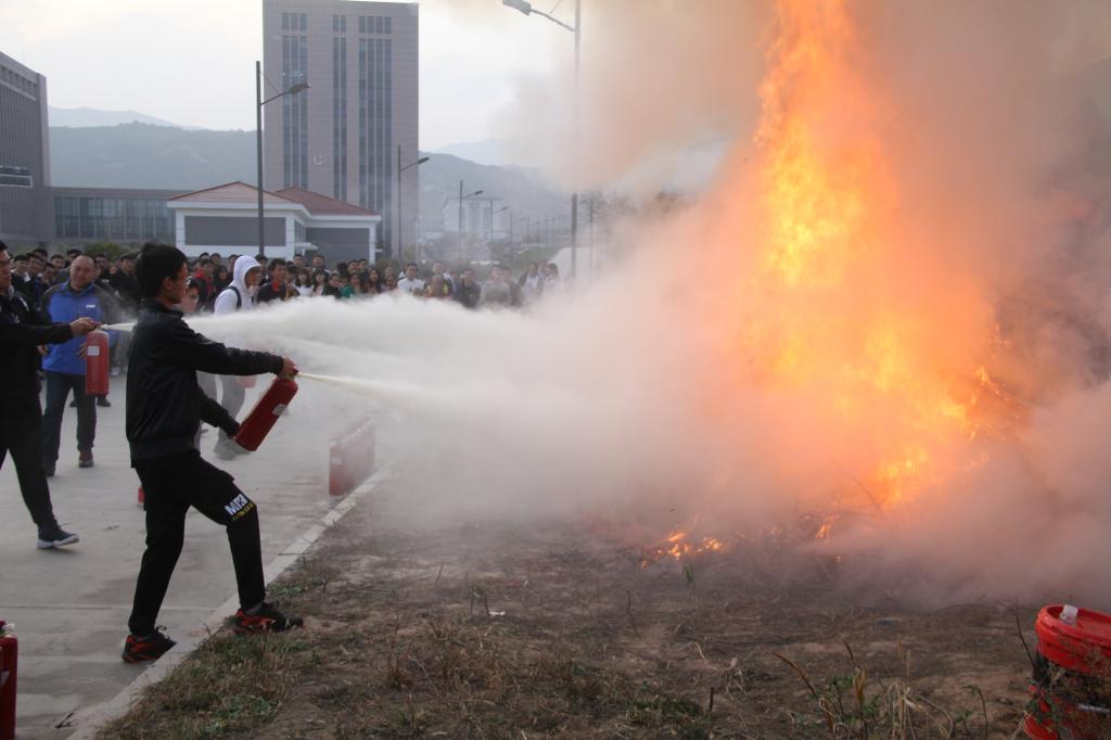 10月22日下午16:30,警铃从低层到高层依次拉响,同学们在听到警铃后迅速有序地撤离宿舍,前往北外环的疏散集中地。在同学们全部到达疏散集中地后,保卫处安全科向同学们介绍了干粉灭火器的使用方法。安全员点燃了在空地上事先准备好的木料,将干粉灭火器提到距火源适当位置后,让喷嘴对准燃烧最猛烈处,拔去保险销,压下压把,对大火进行扑灭。